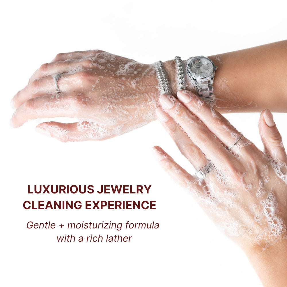 - Leave your jewelry on. Wet hands with warm water and dispense 3–4 pumps into the palm of your hand, working into a generous lather. Massage the bubbles into your jewelry to lift away dirt, oil, and buildup. Rinse thoroughly and pat dry.